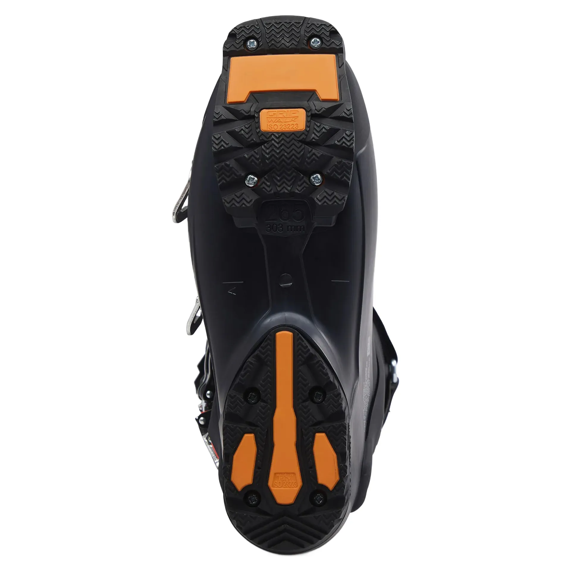 Thick rubber tread and convex toe profile offering increased traction and natural foot roll for enhanced hiking and walking comfort. Integrated stiff pads guarantee optimized power transmission and full Alpine release function.
